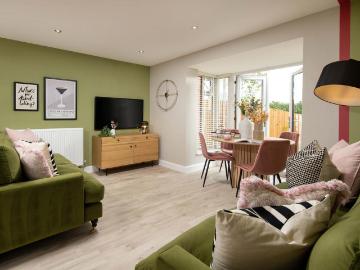 Plot 38 | The Waysdale | The Quarters Inside, the open plan fitted kitchen and family area has a breakfast bar to make cooking a sociable experience. It also features double doors that look out onto the garden, perfect for keeping an eye on the kids or hosting a BBQ with friends in the summer. The spacious living room also features double doors to the garden, providing plenty of light to fill the room. The separate dining room at the front of the home provides the perfect location to host a dinner party with family away from the kitchen. The Waysdale is a popular home with plenty of space for all the family to enjoy.Tenure: FreeholdEstate management fee: £287.57Council Tax Band: TBC - Council Tax Band will be confirmed by the local authority on completion of the property
